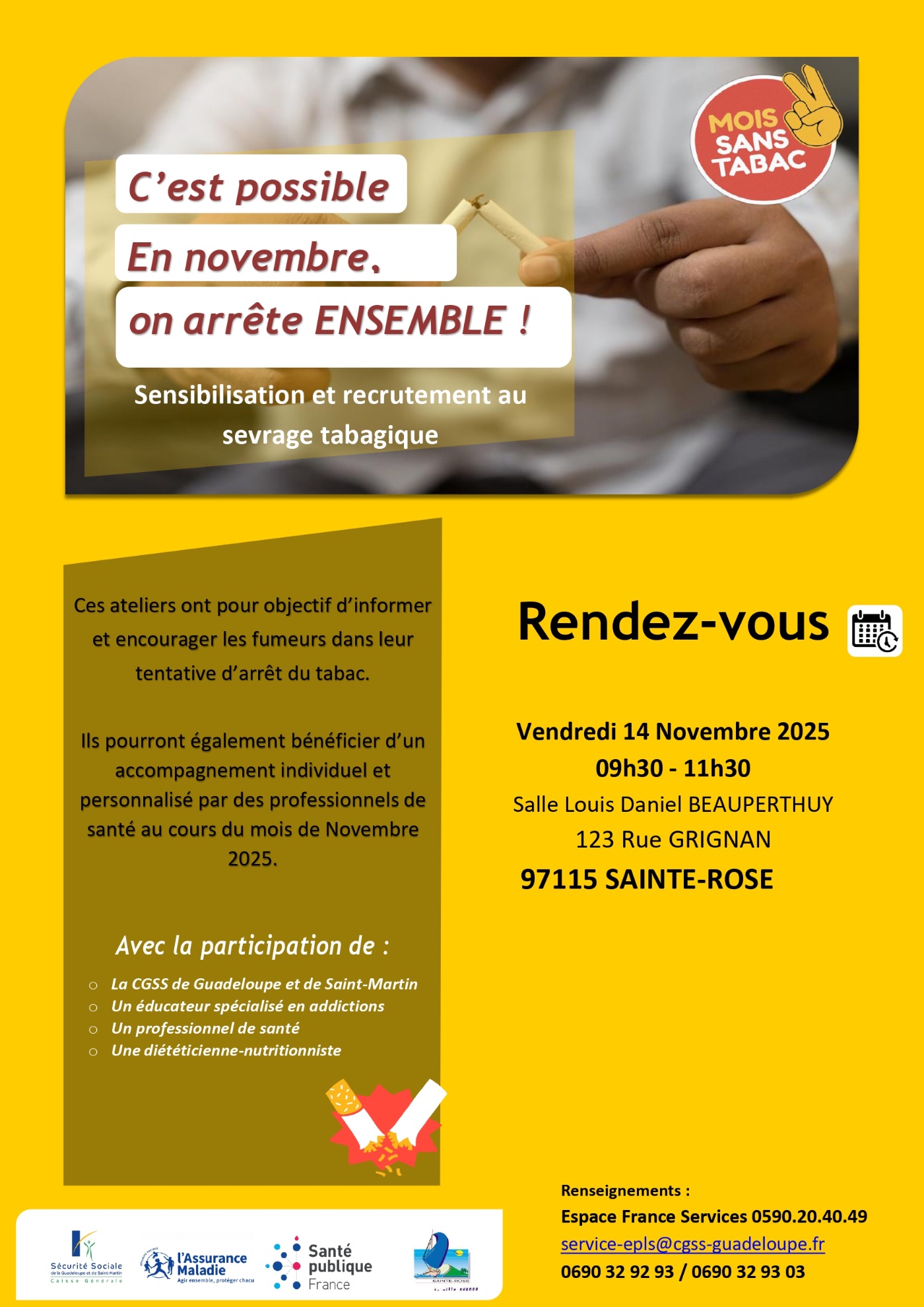 Dans le cadre du « Mois Sans Tabac », la Ville de Sainte-Rose, en partenariat avec la CGSS de Guadeloupe et de Saint-Martin, organise un atelier de sensibilisation et de recrutement au sevrage tabagique le vendredi 14 novembre 2025, de 9h30 à 11h30, à la Salle Louis Daniel BEAUPERTHUY.