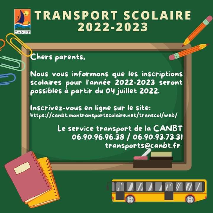 Le service transport et mobilité de la CANBT vous informe que les inscriptions au transport scolaire au titre de la rentrée 2022-2023 seront possibles à compter du 04 juillet 2022 exclusivement sur internet.